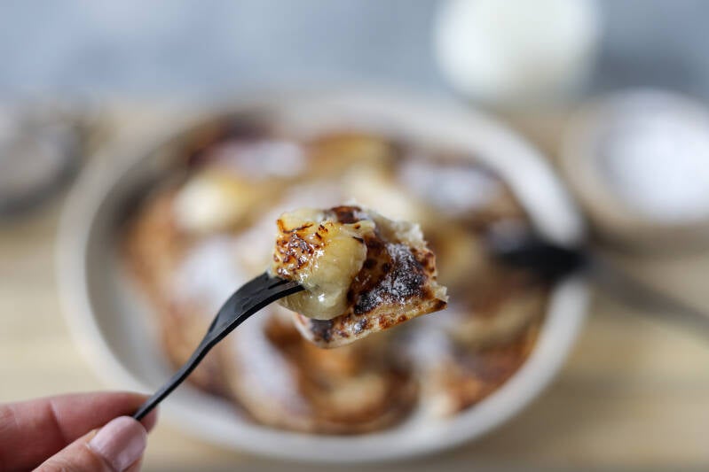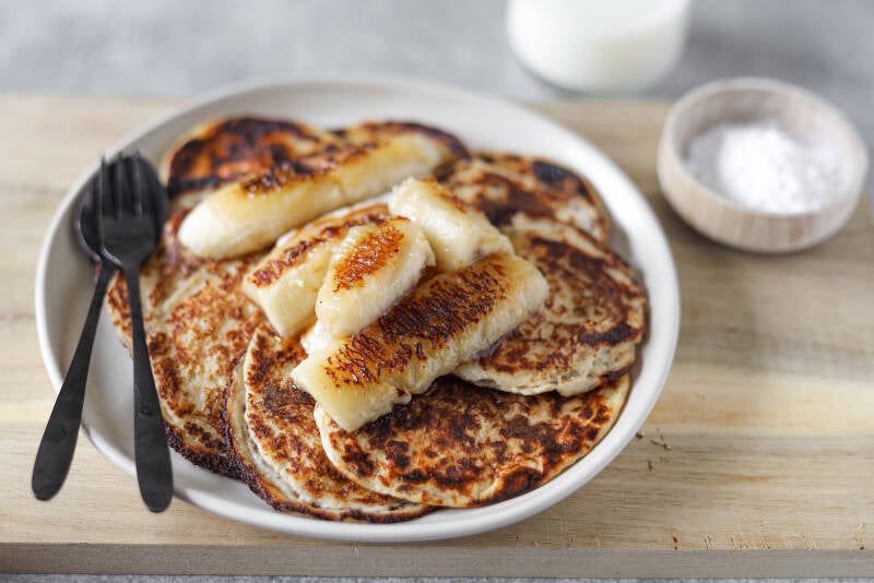 - Als je alle pannenkoekjes hebt gebakken kun je in dezelfde pan opnieuw wat olie doen en hierin kort aan beide zijden de banaan bakken