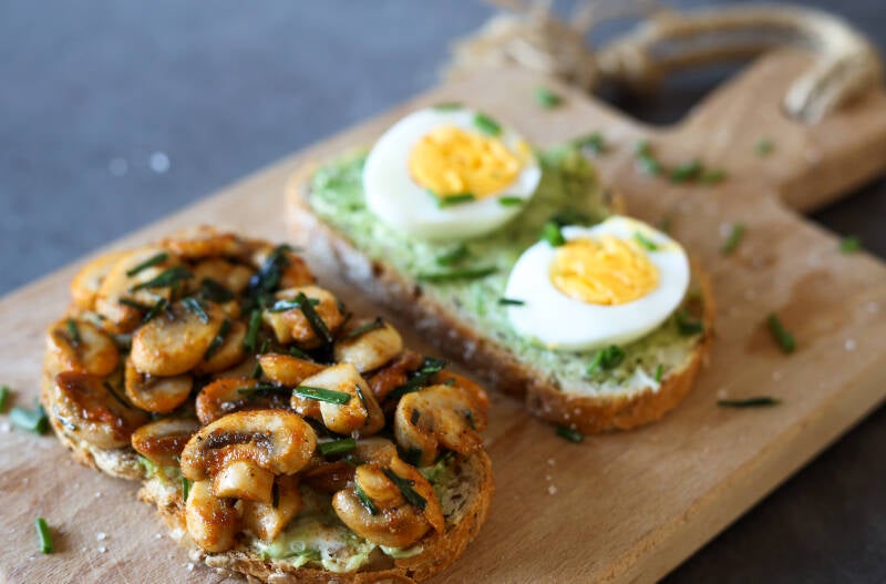 - Smeer het avocado mengsel over het brood, leg op het ene brood het ei en verdeel over het andere de champignons