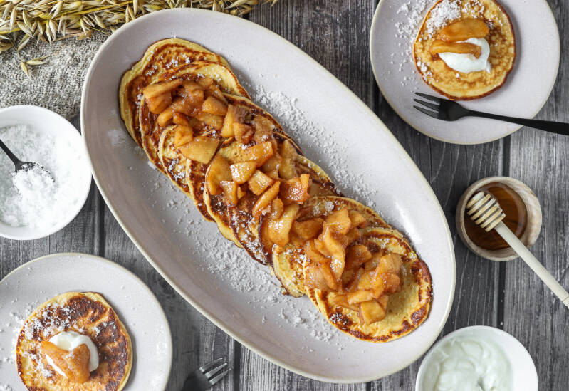 Deze luchtige pannenkoekjes zijn gluten- en lactosevrij mits je glutenvrij havermeel gebruikt.