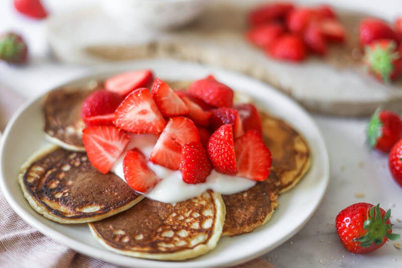 - Meng de yoghurt, het ei, havermeel en bakpoeder tot een beslag