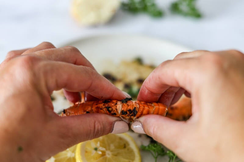 1.Pak de langoustine tussen beide handen met de bolle bovenkant boven