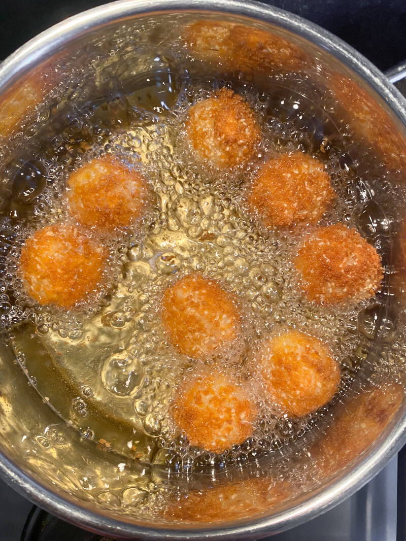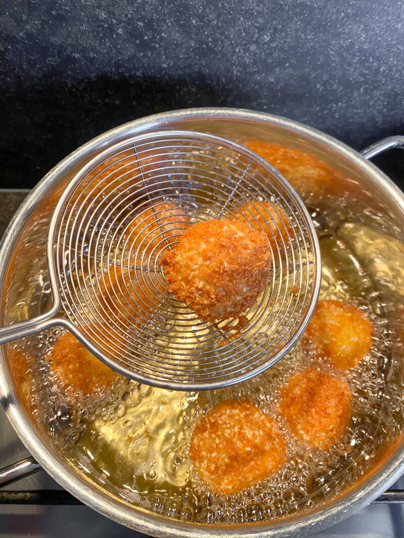 - Frituur de balletjes in de opgewarmde olie ongeveer 3 minuten tot ze mooi lichtbruin zien